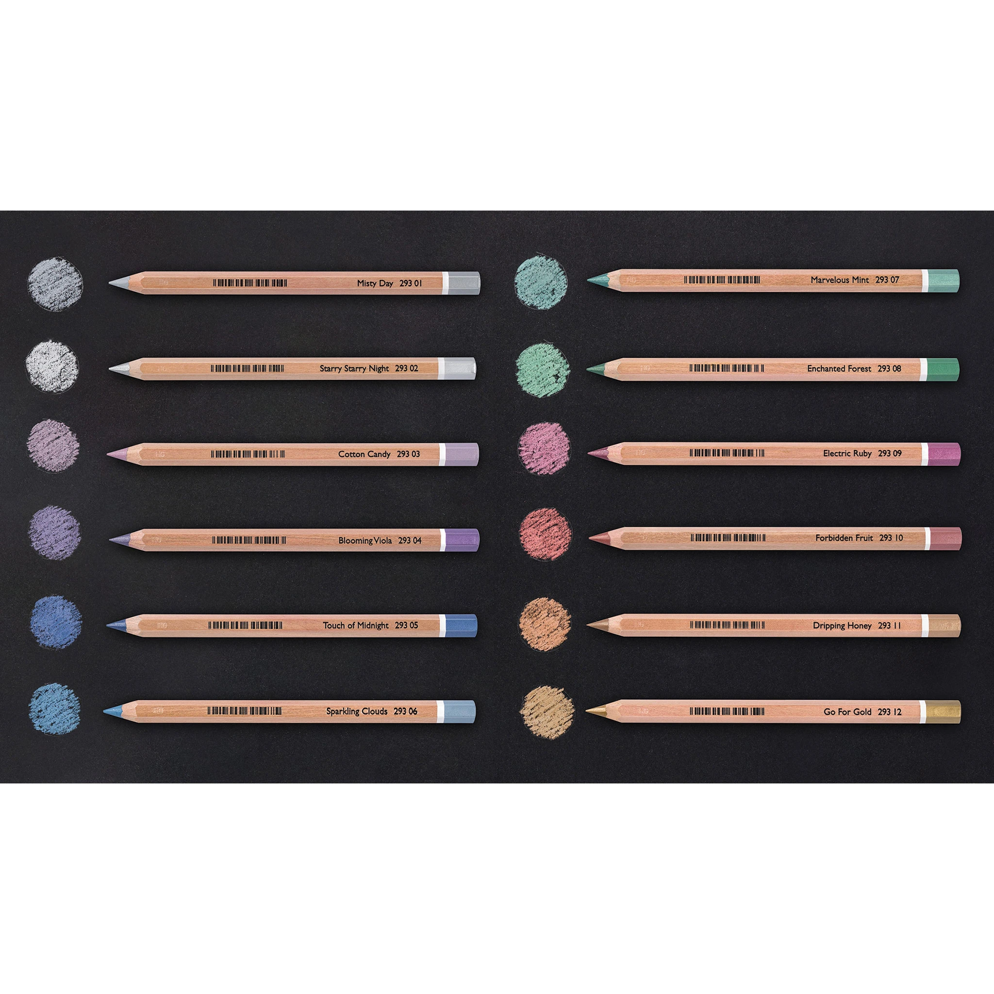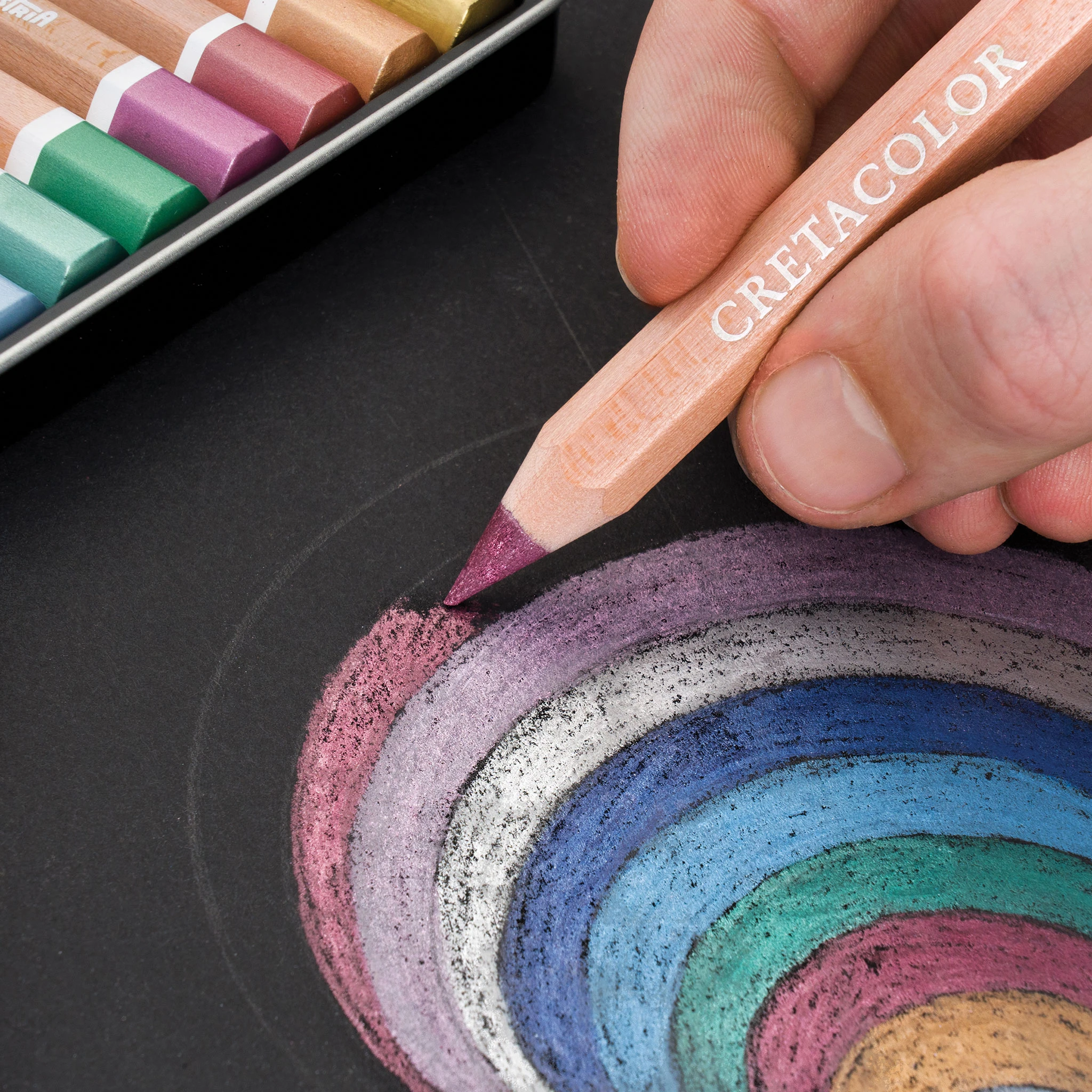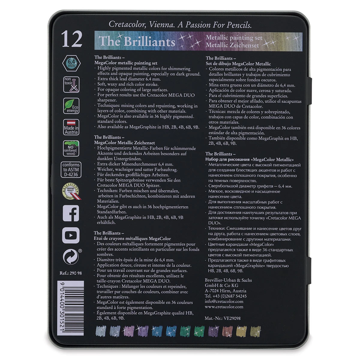 The extra-large barrels and highly pigmented 6.4 mm cores in the Cretacolor The Brilliants Metallic Drawing Set make these colored pencils comfortable to use as they lay down smooth metallic colors in drawings. Achieve shimmering effects with each stroke of the these soft, wax based pencils.