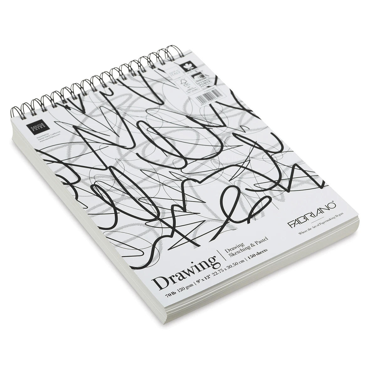 Suitable for drawing, sketching, and pastel work, the Fabriano Studio Drawing Fat Pad is a 9″ × 12″ pad that holds 150 sheets of 70 lb (120 gsm) paper, wirebound on the short side.