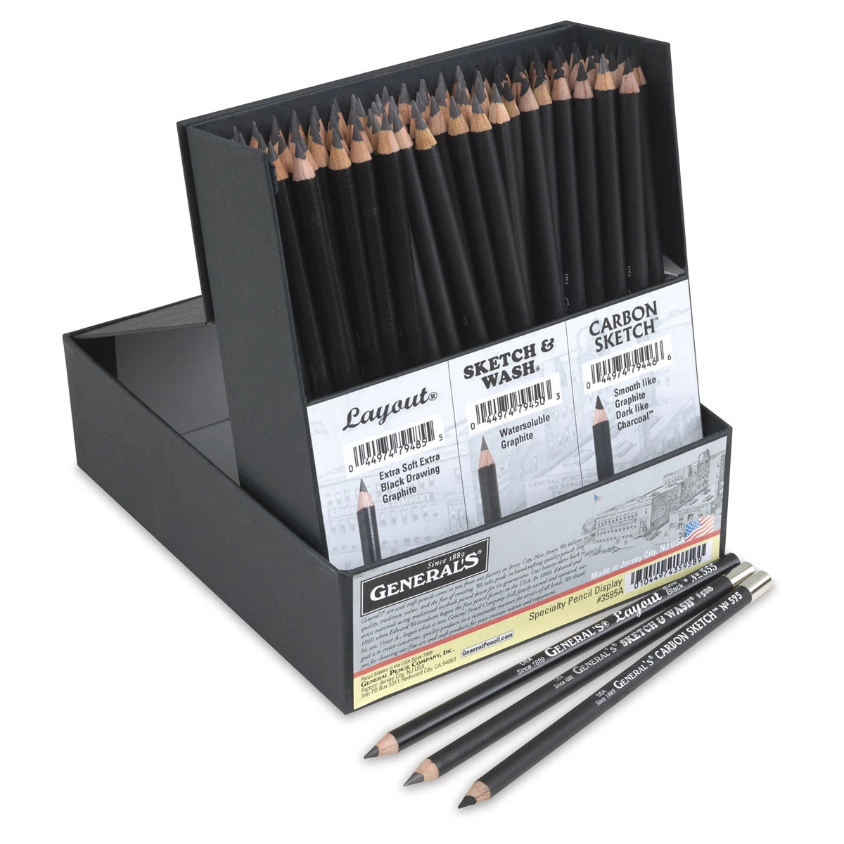 This handy stand-up pencil pack is ideal for classrooms, studios, and galleries. It holds 36 General’s Layout Drawing Pencils, 36 Carbon Sketch Drawing Pencils, and 36 Sketch & Wash Watersoluble Graphite Drawing Pencils, for a wide variety of sketching and drawing techniques.