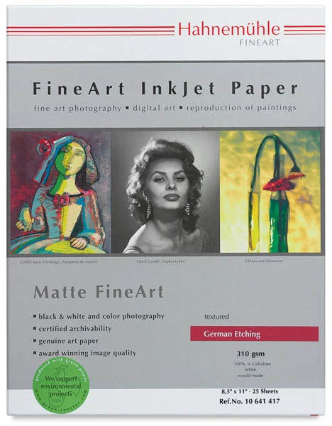 Hahnemühle German Etching Inkjet Paper is a 100% alpha-cellulose , velvety smooth, white etching board with a fine surface texture.