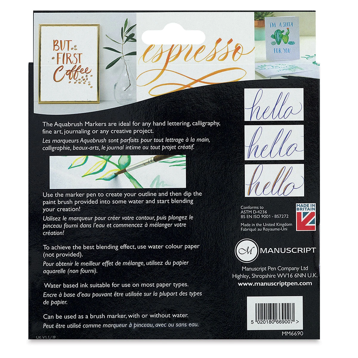 Manuscript Aqua Brush Markers are perfect for lettering, calligraphy, illustration, and creative blending by artists of all skill levels. Filled with a waterbased ink, the markers have a cylindrical body with an ergonomic triangular grip. A paint brush for blending is included, which can also be dip…