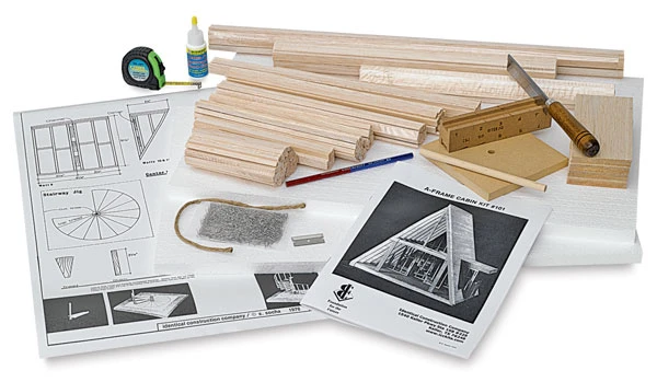 This kit includes everything you need to create a 3/4″ scale model of a one-bedroom A-Frame Cabin with a bathroom, kitchen, living room, spiral staircase, and loft.