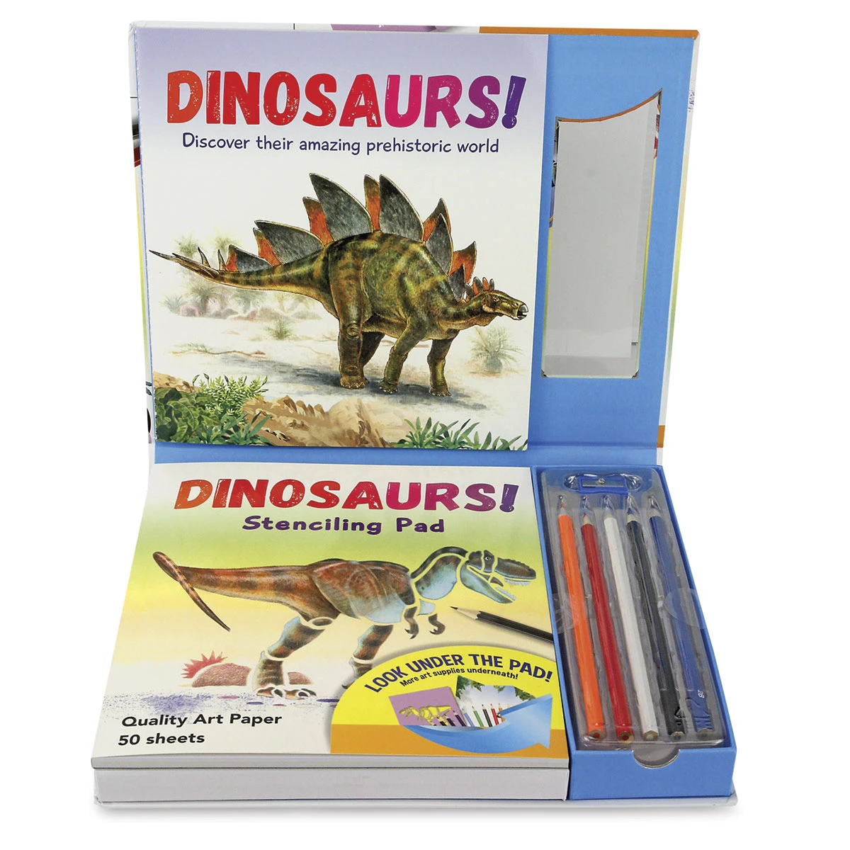 Go back in time and explore the prehistoric world of dinosaurs with Spicebox Imagine It Dinosaurs Stencil and Color Kit! Trace, draw, and color the largest creatures ever to walk the planet while learning incredible dinosaur facts. This fun and educational kit is perfect for ages 6+ and includes eve…