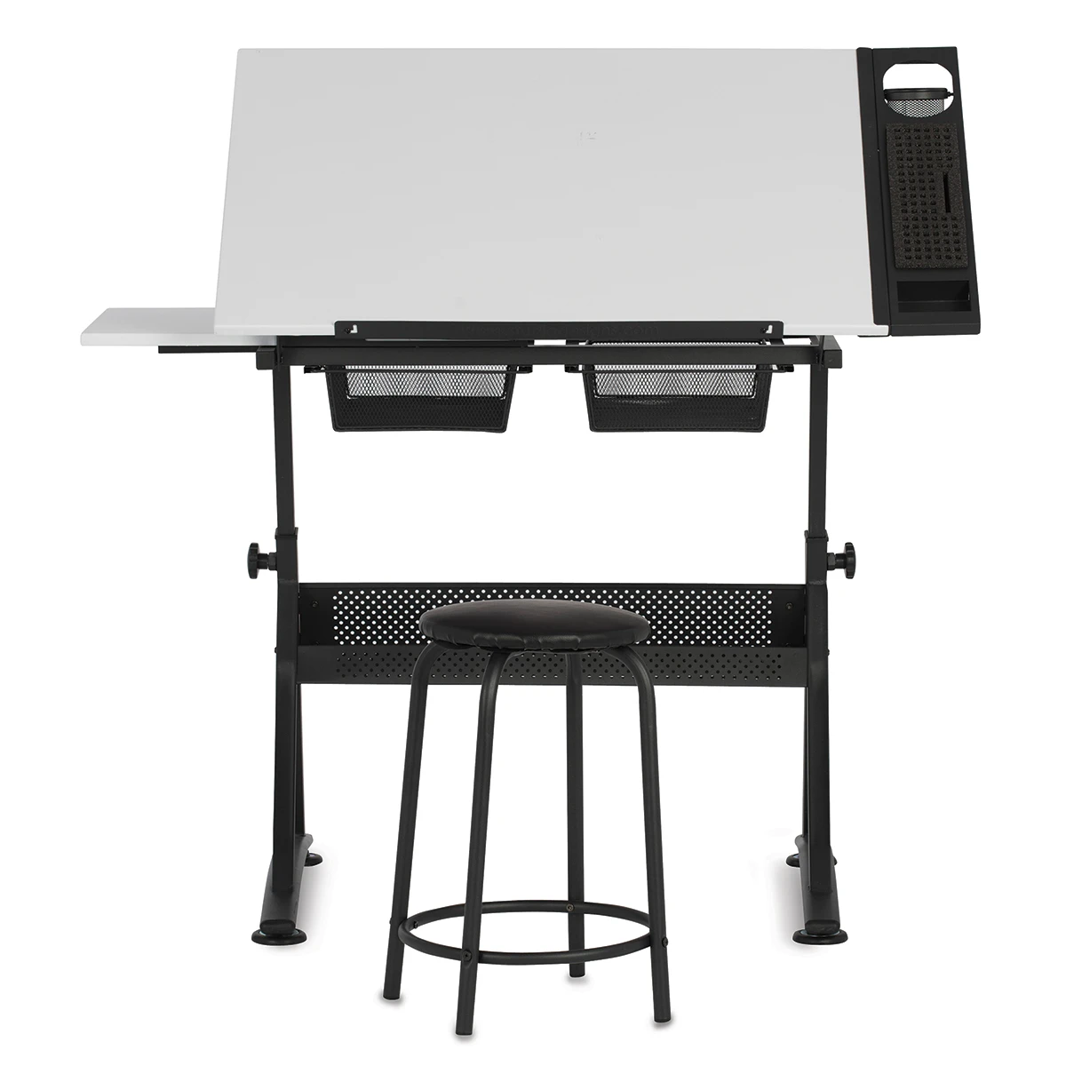 The Studio Designs Fusion Center provides plenty of workspace plus storage galore with a lower shelf, mesh drawers, and a foam organizer for pencils, markers, and brushes. The set also includes a padded stool (21″H).