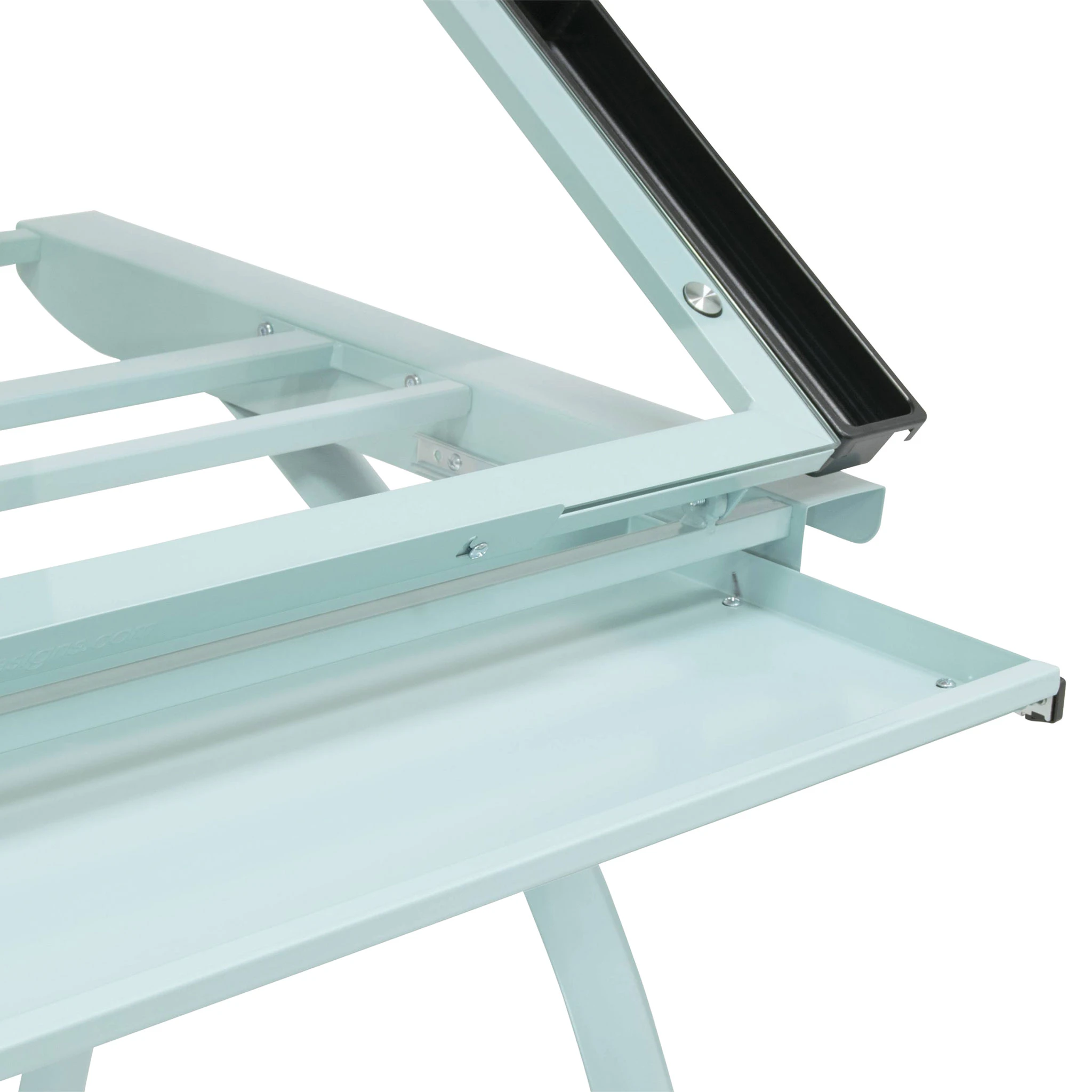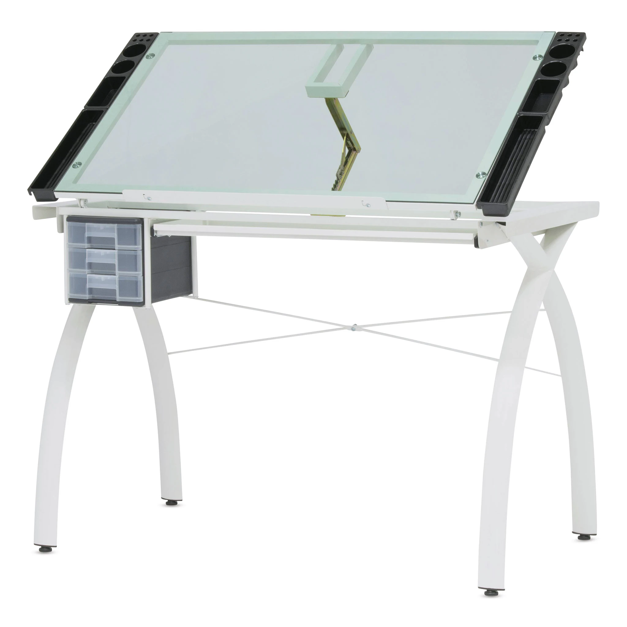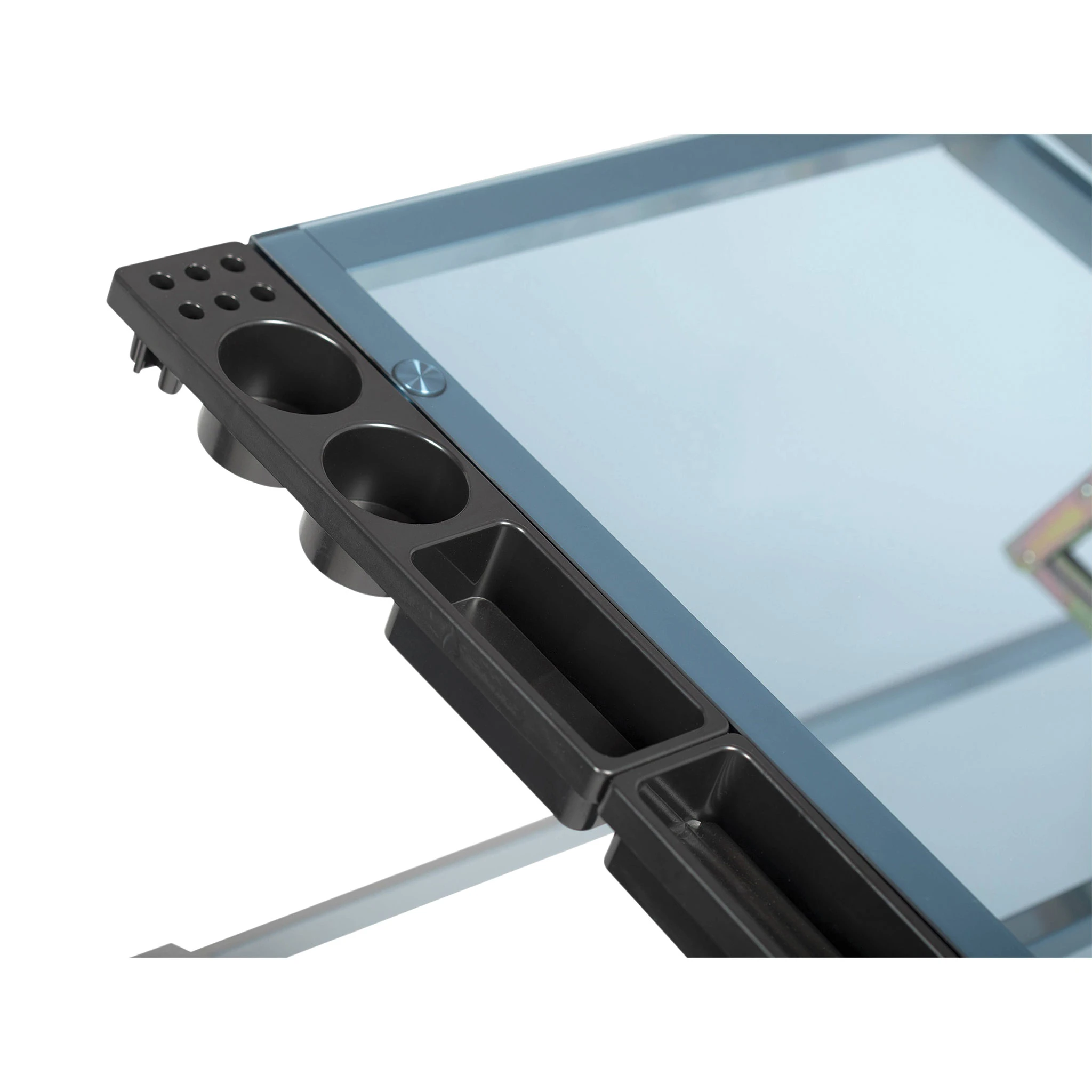 This stylish table has a 38″ W x 24″ D (97 cm x 61 cm) tempered safety glass top with a 24″ (61 cm) pencil ledge. The tabletop angle adjusts up to 35°. Features include three molded plastic slide-out drawers for storage. The table is constructed of heavy-gauge steel for durability and includes four …